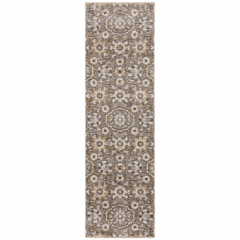 2" X 8" Grey And Tan Floral Power Loom Stain Resistant Runner Rug With Fringe