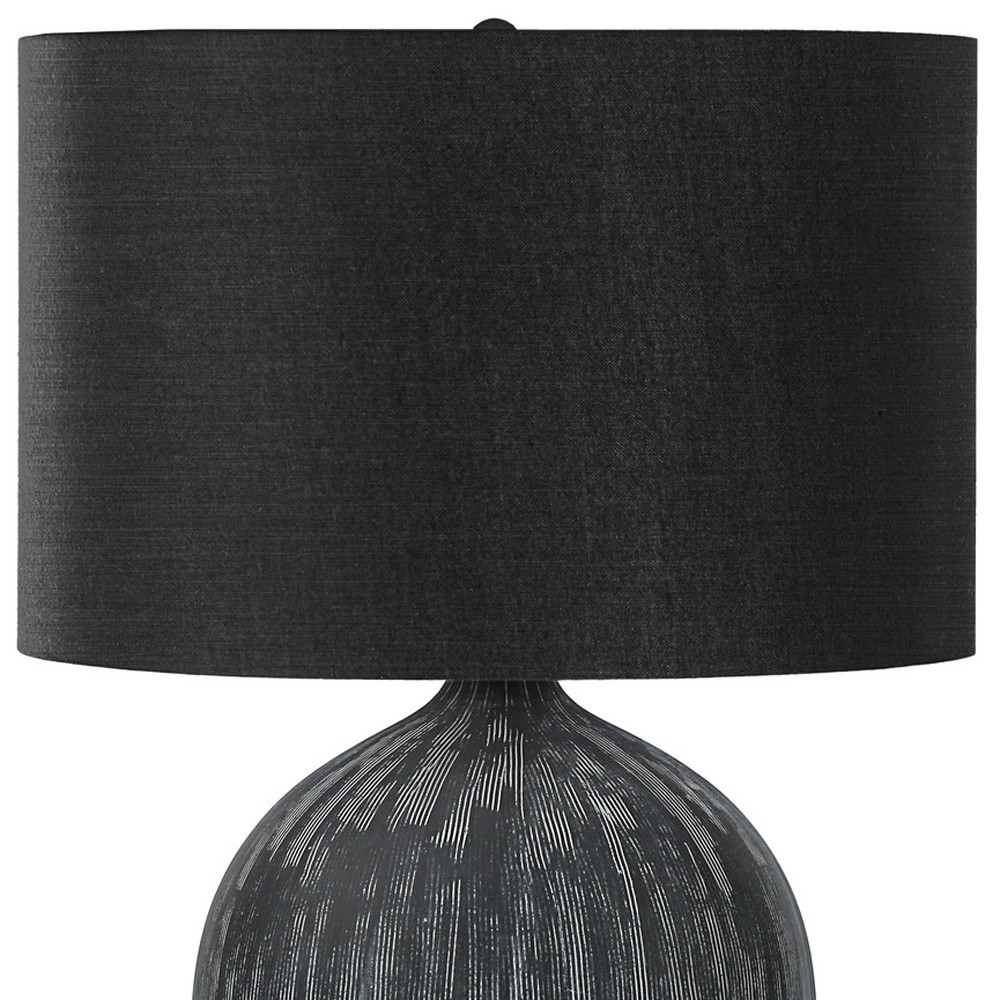 Add a bright anchor to your room with this 23-inch black ceramic round table lamp with black drum shade. A gorgeous black textured ceramic base brings just the right amount of pizzazz to this fabulous lamp. Includes a black linen, drum shaped shade, making this a fashionable piece that will complement most any interior. This standard table lamp is designed to provide general lighting to the area. The light that this lamp throws is soft and warm to elevate the look of most any space in your home. Bring some lite and good vibes into your space with this updated and stylishly designed lamp. 23-inch H x 16-inch W x 16-inch D