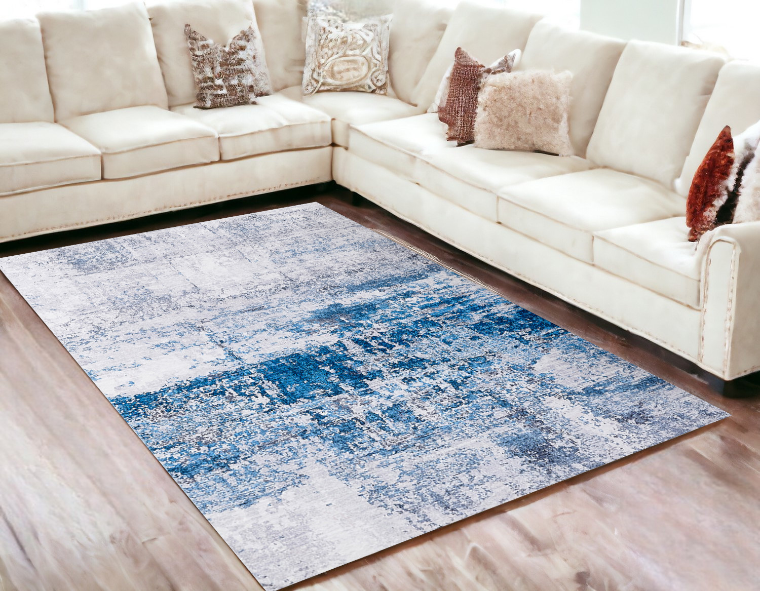 This 5-foot x 7-foot gray and blue abstract printed washable non skid area rug, is a great way to add warmth to a room. This rectangle shaped rug features a abstract design in gray and blue to give it visual interest. A classic shape marries with good looking design for your space ideal for spaces with kids and pets, this rug is stain resistant to help repel stains and spilled liquids. Area rugs help to give warmth and sense of home to your space. 60-inch H x 79-inch W x 1-inch D