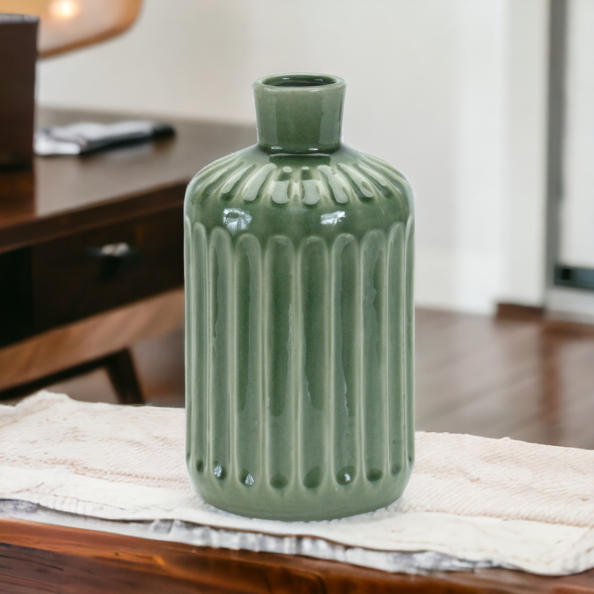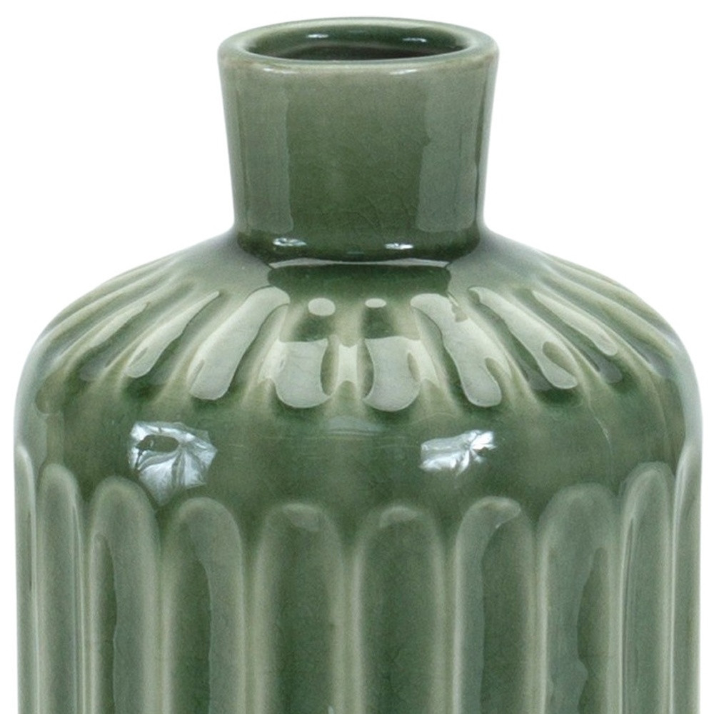 Elevate your home decor with this stunning 9-inch green terracotta striped bud table vase. Crafted from high-quality terra cotta ceramic, this vase features a unique bottleneck shape and a striped / ribbed design that adds a touch of charm to any room. The translucent green ceramic glaze brings a pop of color to your decor, perfect for adding a fresh and natural feel. The design effortlessly complements both traditional and modern interiors, making it a versatile decor piece for your home. Place this stunning vase on your table or shelf to showcase fresh flowers or simply let it stand alone as a striking decorative accent. 9-inch H x 5.25-inch W x 5.25-inch D