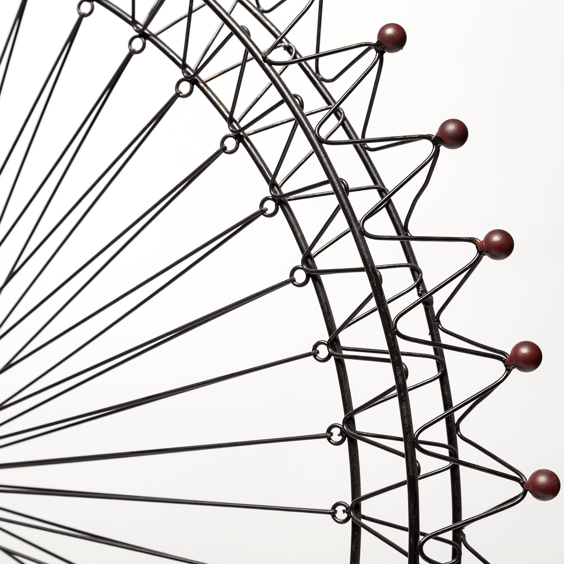 Bring in a touch of global design to your home with this super cool Metal and Wood London Eye Moveable Sculpture. This piece is made from a mix of different materials. The base is made of wood and is in the shape of a rectangular block which is colored to a dark brown finish. Attached to this base there are two metal rods on either side that extend up and meet in the middle of the London eye Ferris wheel shape. The Ferris wheel has three circular shapes that spokes joining in the middle on the inside and triangular spokes on the outside. This decor piece will look great on your bookshelf, your fireplace, or as part of your home office decor. 32" H x 29" W x 5" D
